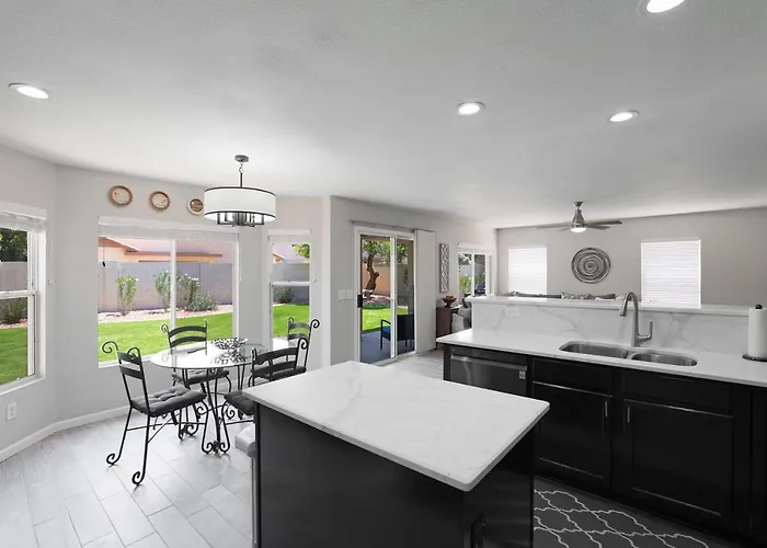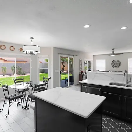 Surprise Gem Villa features an equipped kitchen with tea and coffee making equipment, a fridge, and a kitchenware. Babbo Italian Eatery is a dining choice located 0.9 miles away. The 3-bathroom villa is also located 36 minutes by car from Phoenix Goodyear airport.
